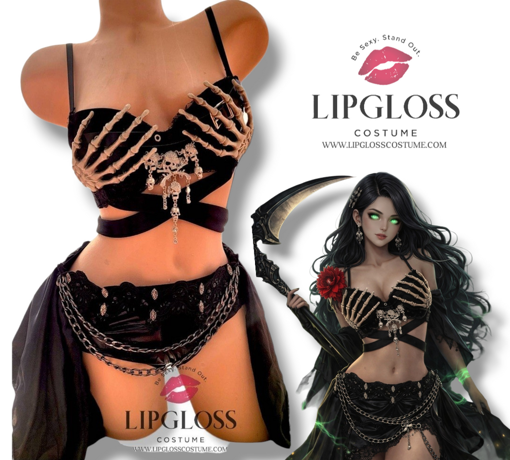 Unleash your dark goddess energy with this bold Grim Reaper Skeleton Hands Outfit. Designed for women who love gothic fashion, rave culture, and statement Halloween looks, this unique costume blends edgy skeleton details with a flattering festival-ready silhouette.